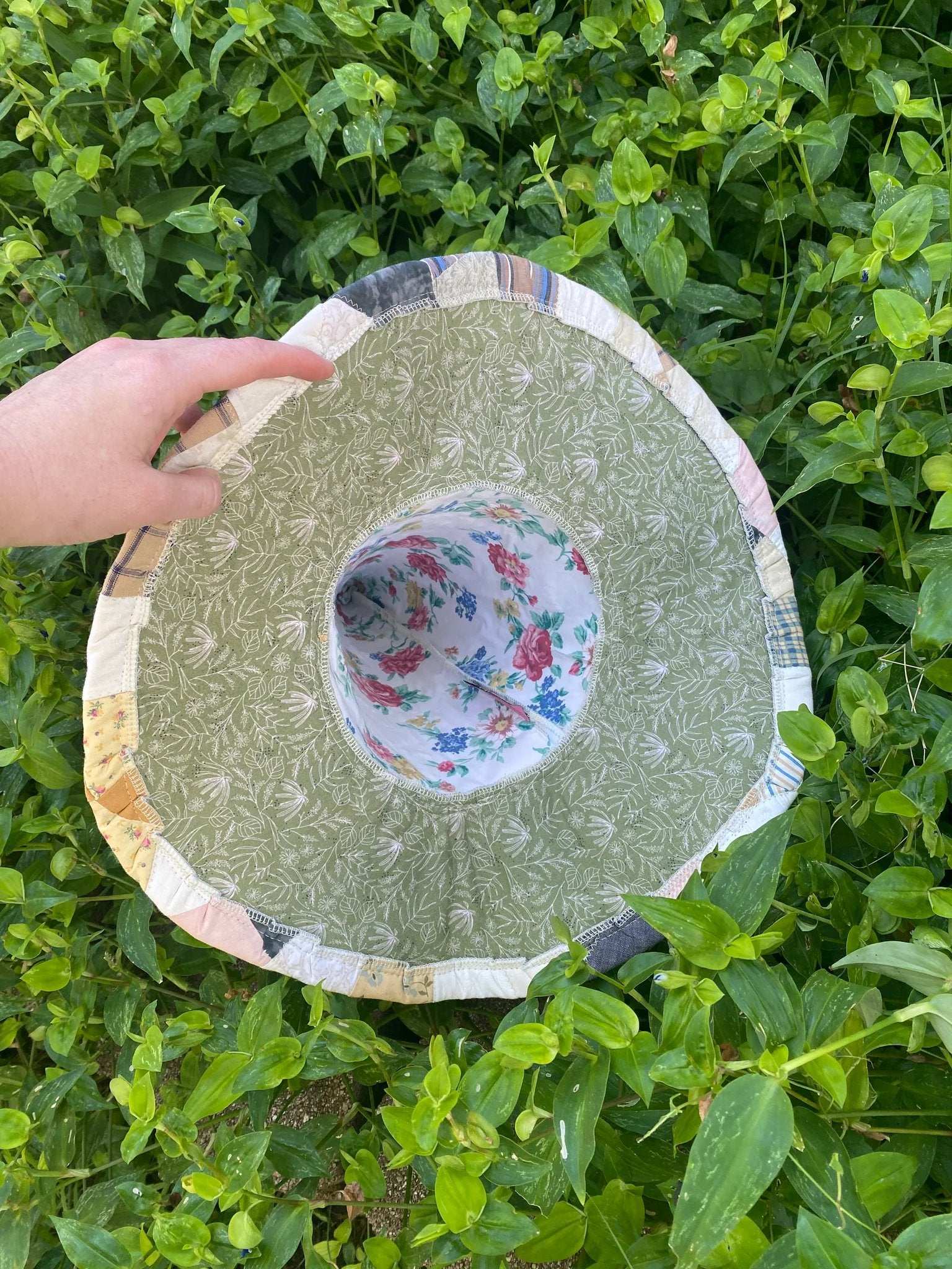 Every hat begins with a carefully chosen vintage quilt, each one rich with the whispers of the past. I source these pre-loved textiles from across Oklahoma, giving them new life through thoughtful design. The main body is crafted from these reclaimed quilt cottons, celebrated for their softness and timeless patterns.